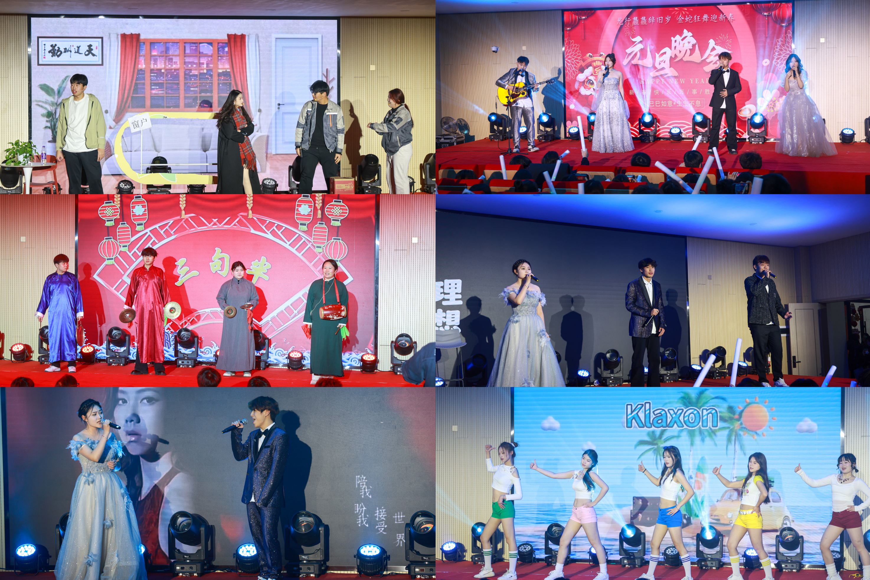 当动感的音乐轰然奏响,舞台瞬间化作热情四溢的梦幻之境。动感十足的舞蹈,悠扬婉转的歌曲,寓教于乐的小品……让人目不暇接、意犹未尽,引得台下尖叫连连,掌声如雷。情景剧《考场风云》展现了我校学生的蓬勃朝气,大家用诚信诠释着对生活的热爱、用激情书写着校园的美好,让演出现场都沉浸在一片欢乐的海洋之中。舞蹈《民族贺元旦》更是将现场气氛推向了高潮,姑娘们笑容灿烂,以整齐划一的动作奏响新年的欢歌,用舞步踏出民族团结的和谐乐章。伴随着大合唱《开心往前飞》那欢快而激昂的歌声,整个会场沉浸在一片喜庆与温馨的氛围之中,元旦晚会在一片欢声笑语与热烈的掌声中缓缓落下帷幕。